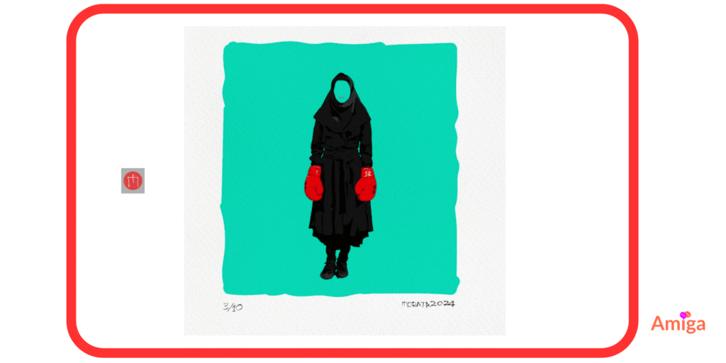 Si bien la fotografía original tiene como telón de fondo la ciudad de Teherán, la versión de Rodrigo es diferente: “Quise conservar el traje negro del hiyab y por supuesto los emblemáticos guantes rojos, pero no la ciudad, mi obra maneja los fondos de una manera diferente y seleccioné el color verde agua que significa protección. La considero una obra impactante y muy conmovedora”.